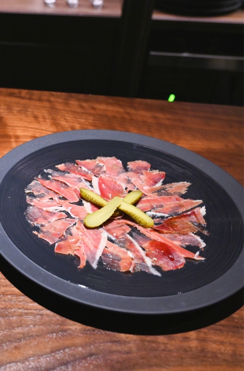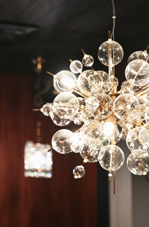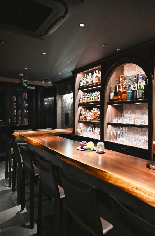 1Fは重厚なカウンターと照明が演出する